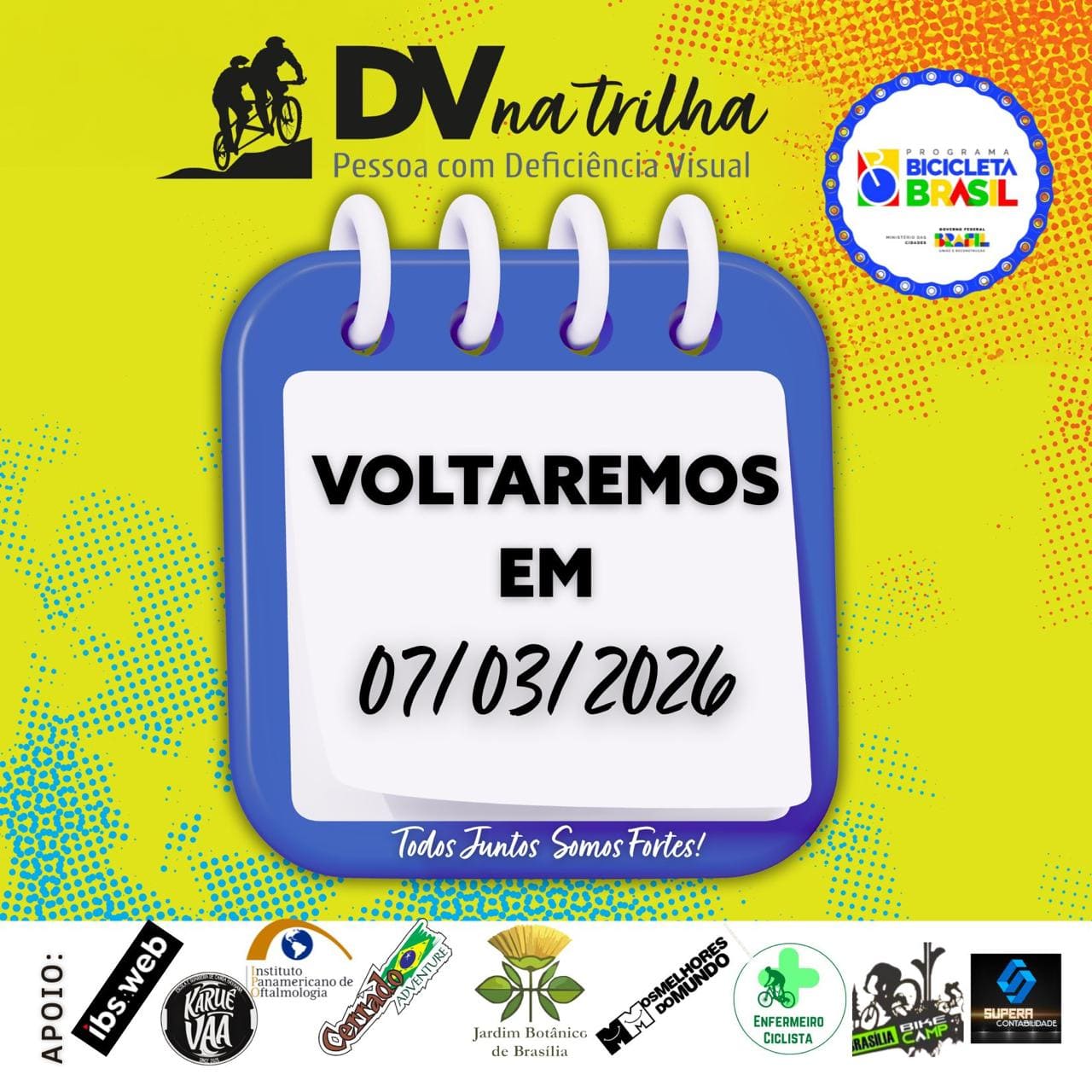 Parte superior, lado esquerdo: logotipo preto escrito "DV na trilha". Composto pelo desenho de dois ciclistas em uma bicicleta de dois lugares. Abaixo, diz: "Pessoa com Deficiência Visual".