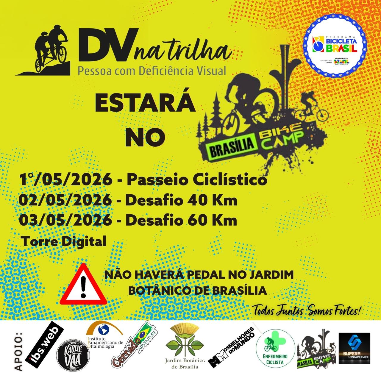 Logotipo DV na Trilha: No canto superior esquerdo, aparece o nome "DV na trilha" em letras grandes e pretas. Acima do "DV", há um ícone preto de uma bicicleta tandem (para duas pessoas). Abaixo, a frase "Pessoa com Deficiência Visual".